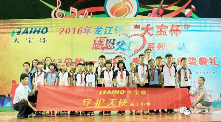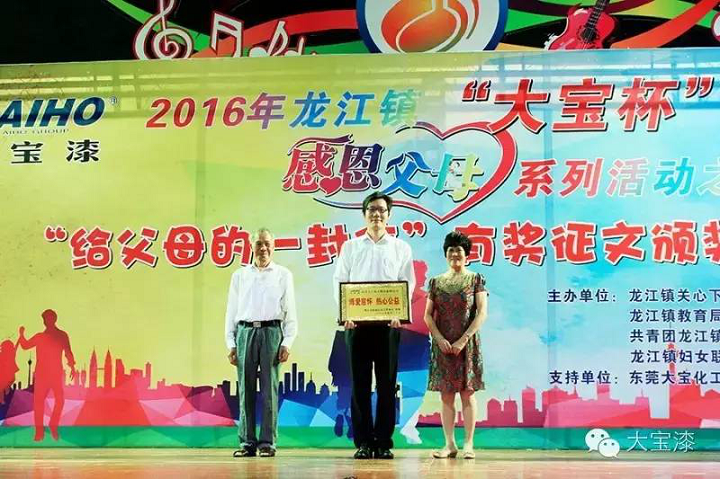5月20日,由佛山龍江鎮(zhèn)教育局、龍江鎮(zhèn)關(guān)心下一代委員會(huì)與大寶漆共同主辦的2016年龍江鎮(zhèn)“大寶杯”感恩父母系列活動(dòng)之“給父母的一封信”有獎(jiǎng)?wù)魑念C獎(jiǎng)典禮在龍江鎮(zhèn)城區(qū)中心小學(xué)舉辦。佛山龍江鎮(zhèn)教育局和龍江鎮(zhèn)關(guān)心下一代委員會(huì)在頒獎(jiǎng)典禮上授予大寶漆“博愛慈懷熱心公益”稱號。大寶化工企劃部楊忠榮副理、龍江鎮(zhèn)關(guān)心下一代工作委員會(huì)麥煥橋主任、獲獎(jiǎng)小學(xué)生及其家長出席了本次頒獎(jiǎng)典禮。