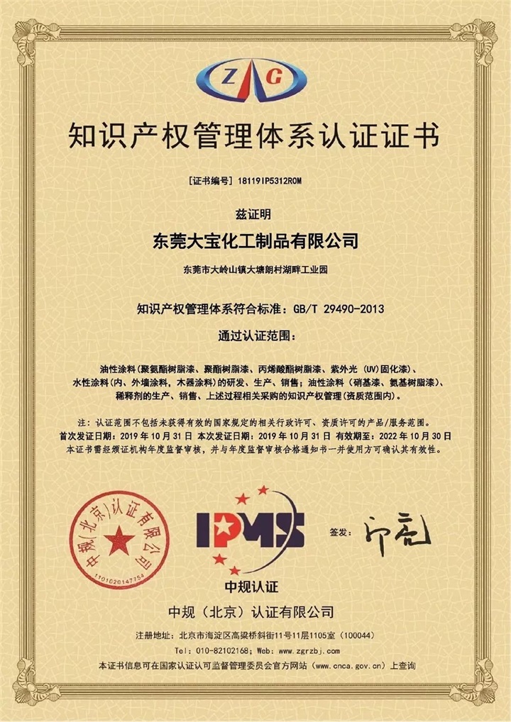 2019年10月31日,東莞大寶化工順利通過(guò)GB/T29490-2013知識(shí)產(chǎn)權(quán)管理體系認(rèn)證,獲得中規(guī)(北京)認(rèn)證有限公司頒發(fā)的認(rèn)證證書(shū)。通過(guò)認(rèn)證范圍包括:油性涂料(聚氨酯樹(shù)脂漆、聚酯樹(shù)脂漆、丙烯酸酯樹(shù)脂漆、紫外光(UV)固化漆)、水性涂料(內(nèi)、外墻涂料,木器涂料)的研發(fā)、生產(chǎn)、銷售;油性涂料(硝基漆、氨基樹(shù)脂漆)、稀釋劑的生產(chǎn)、銷售等涉及的知識(shí)產(chǎn)權(quán)管理。