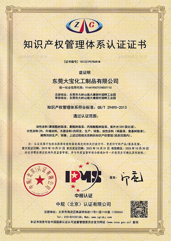4月26日,是第23個(gè)世界知識(shí)產(chǎn)權(quán)日,大寶化工再次通過(guò)國(guó)家企業(yè)知識(shí)產(chǎn)權(quán)管理認(rèn)證,是對(duì)大寶化工近年來(lái)取得創(chuàng)新成果的肯定,同時(shí)也標(biāo)志著大寶漆在知識(shí)產(chǎn)權(quán)創(chuàng)造、運(yùn)用、管理和保護(hù)方面具備領(lǐng)先水平。