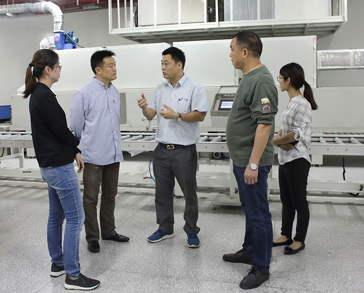 到訪領導一行還參觀了東莞大寶化工現代化的廠房設備、智能化涂裝線、一流的中央實驗室和展示家具漆產品完美施工效果的色板中心等地,增進了彼此的了解和進一步合作的信心。針對“油改水”問題,工作人員向參訪人員介紹了大寶漆水性漆的工藝和質量控制情況,詳細回答了馬總、李總一行對智能涂裝線的提問。考察人員對大寶漆先進的生產管理和環保理念給予了高度評價。