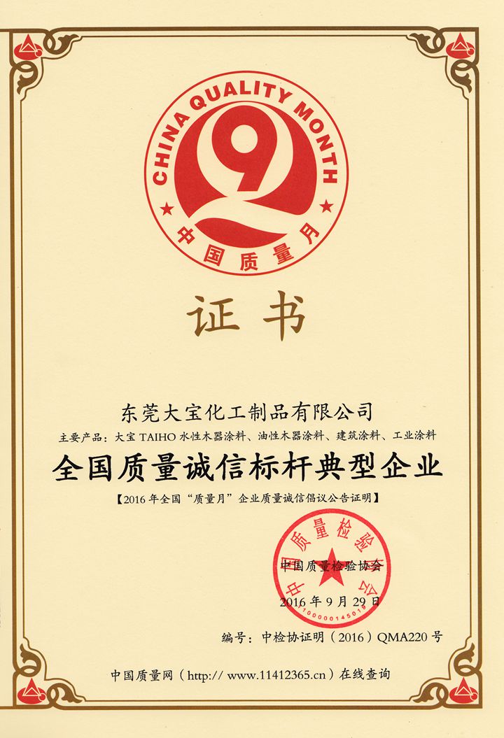 9月29日,中國(guó)質(zhì)監(jiān)總局、中宣部、發(fā)改委、教育部、科技部、工業(yè)和信息化部、環(huán)境保護(hù)部等42個(gè)相關(guān)部門、行業(yè)協(xié)會(huì),共同主辦的2016年全國(guó)“質(zhì)量月”活動(dòng)中,大寶化工憑借過硬的革新技術(shù)、產(chǎn)品質(zhì)量、服務(wù)理念,再次榮獲“全國(guó)質(zhì)量誠(chéng)信標(biāo)桿典型企業(yè)”稱號(hào),并由中國(guó)質(zhì)量檢驗(yàn)協(xié)會(huì)授予相關(guān)證明證書。