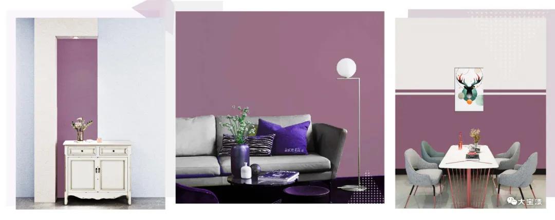 灰、白空間搭配黑加侖紫色布藝、地毯、墻面等,營造出浪漫高雅的視覺效果。用于客廳或臥室等處,為家居空間注入氣質,提升家居的整體魅力。